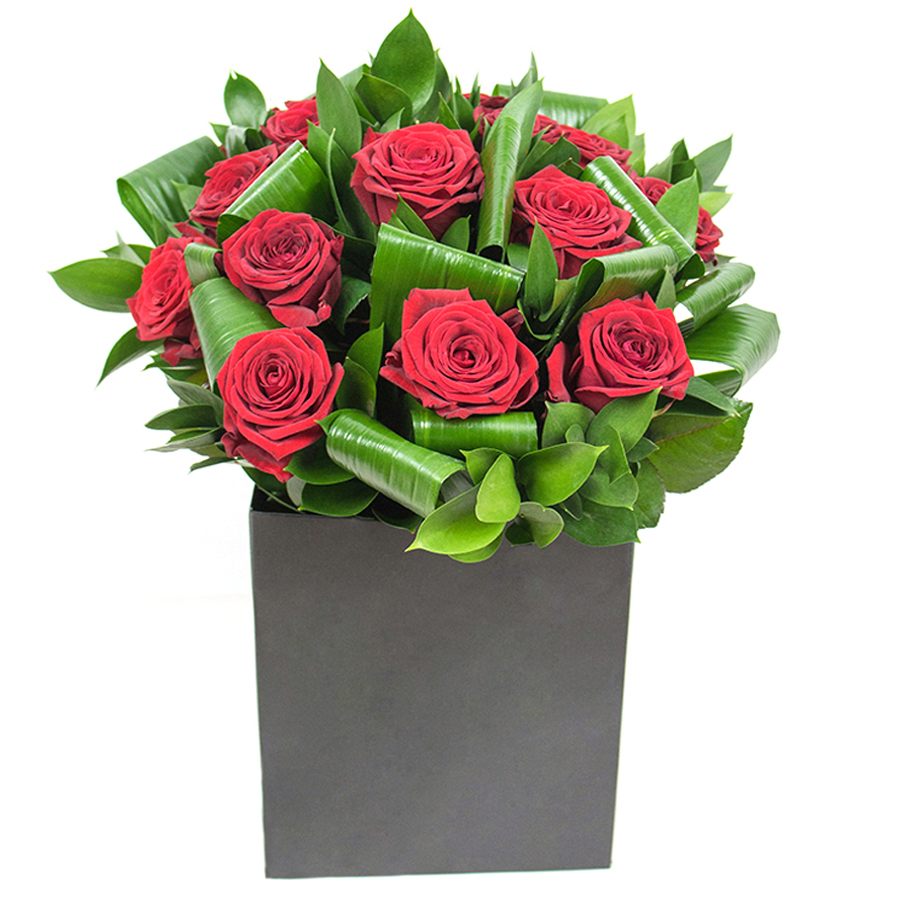 Embrace Timeless Beauty with our breathtaking bouquet of vibrant red roses, lush aspidistra leaves, and elegant ruscus. This unique arrangement is designed to add a touch of sophistication and grace to any home or occasion.